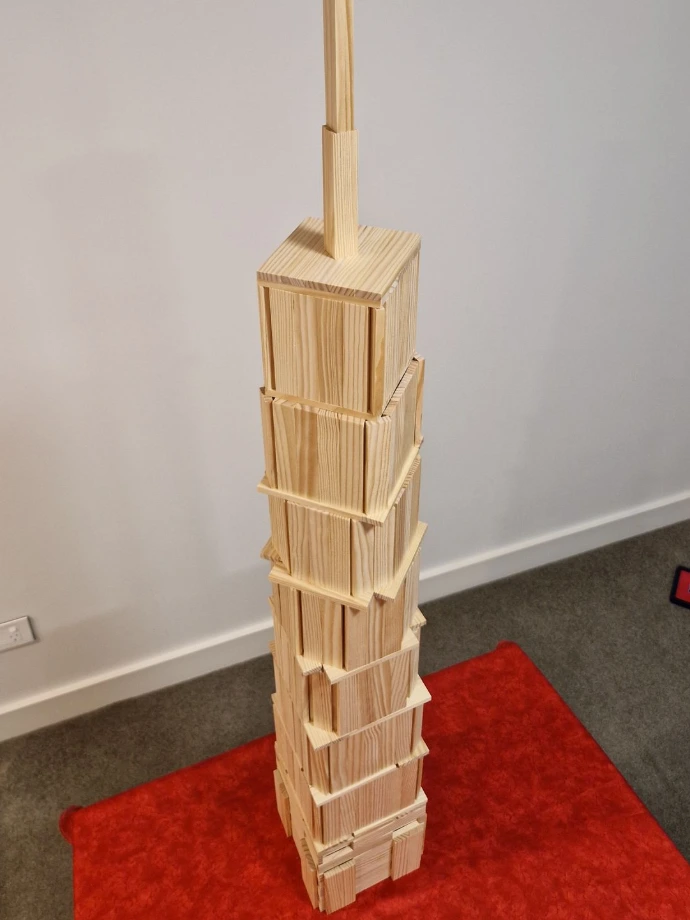 Perfect for skyscraper enthusiasts, architecture lovers, and advanced Kapla builders, this project demonstrates the creativity and stability possible with simple wooden planks.